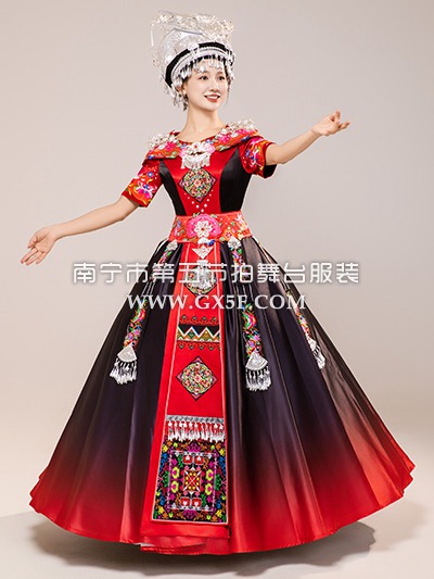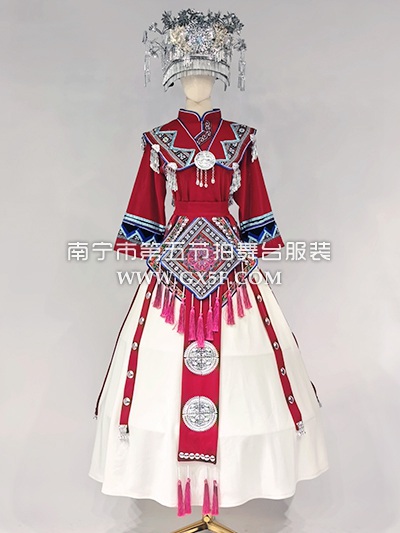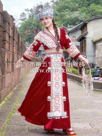 01G960女酒红长袖衣白色长裙苗族盛装