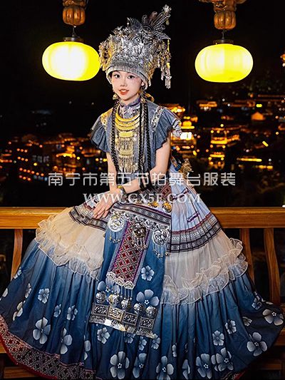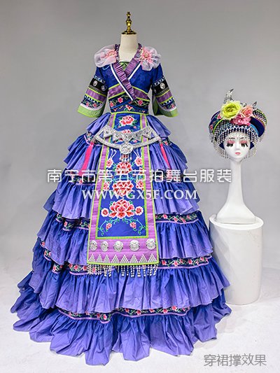 01G935女蓝紫中长袖长裙苗族盛装