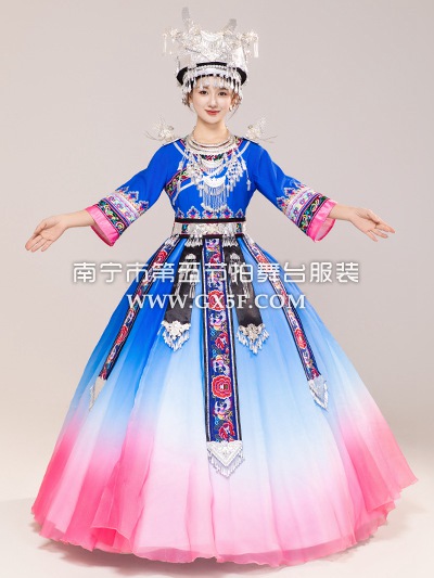 01G929女蓝粉中长袖连衣裙苗族盛装