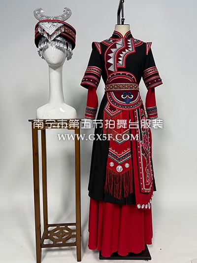 01G973女红黑长袖连衣裙苗族