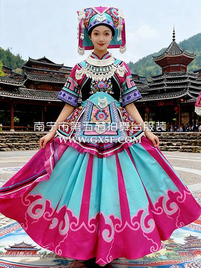 01G963女玫红绿短袖连衣裙苗族盛装
