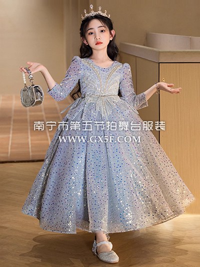12G1832儿童女蓝色亮片中长袖圆领长礼服公
