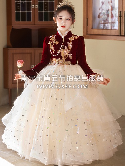 12G1833儿童女红色长袖立领香槟色裙摆长礼