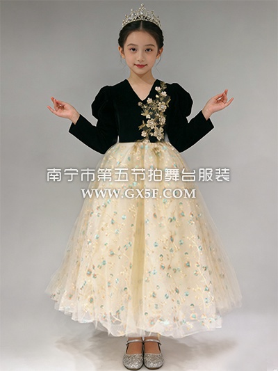 12G1834儿童女黑色长袖香槟色裙摆长礼服公