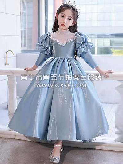12G1845儿童女蓝色高领中长袖长礼服公主裙