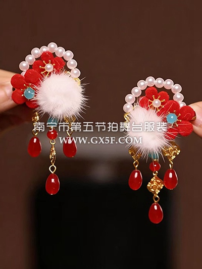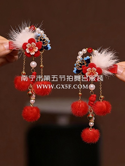 14G4389新年头饰发夹花朵白毛球红色吊珠