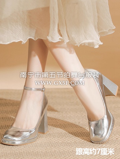 14G5177银色一字扣粗跟玛丽珍单鞋高跟鞋