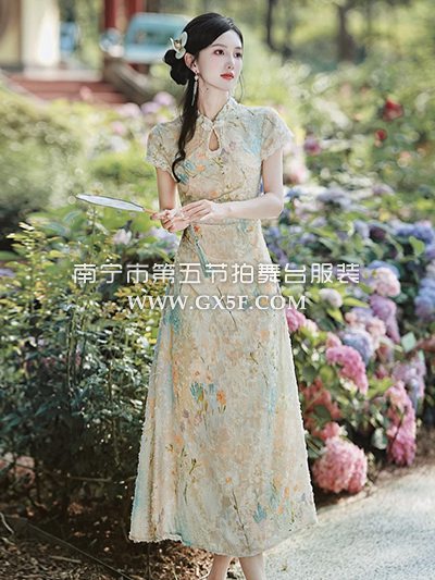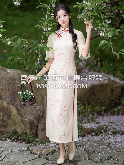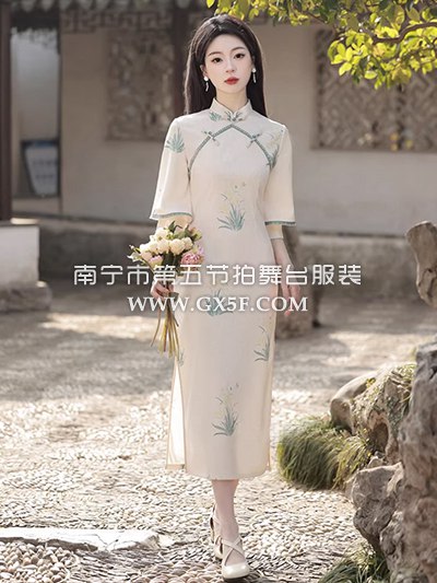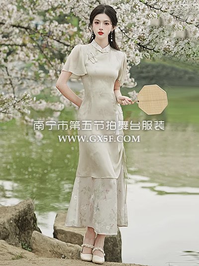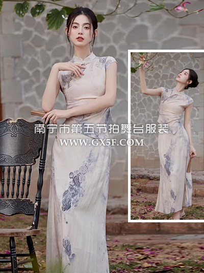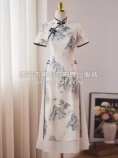 07G435米白色短袖水墨画旗袍奥黛