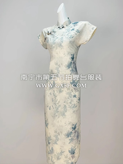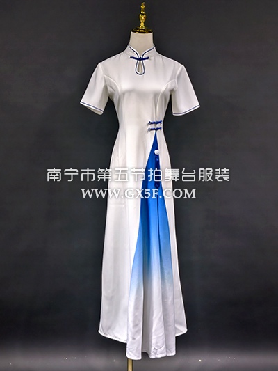 07G452白蓝短袖长旗袍礼仪旗袍连衣裙