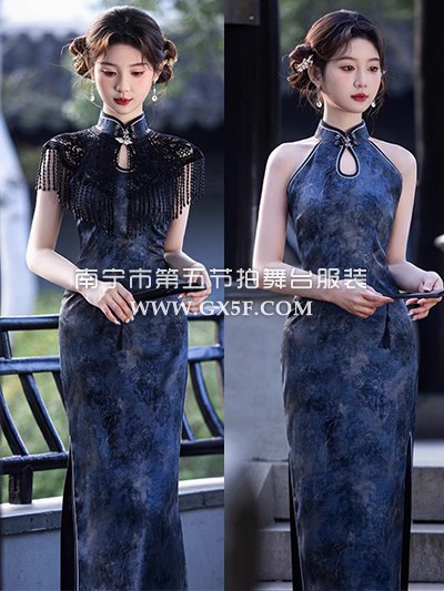 07G442蓝色印花挂脖带云肩新中式长旗袍