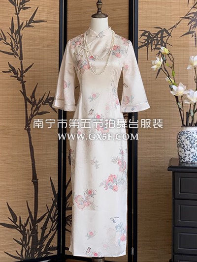 07G456白色花似锦中长袖大摆中长裙旗袍伴