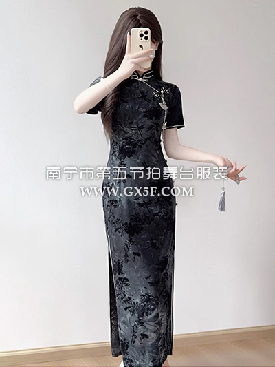 07G451墨黑色植绒扎染短袖中长旗袍
