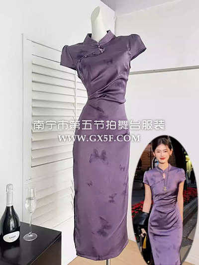 07G448紫色蝴蝶缎面短袖长旗袍