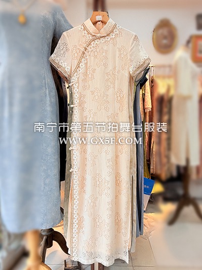 07G454杏色蕾丝短袖长旗袍