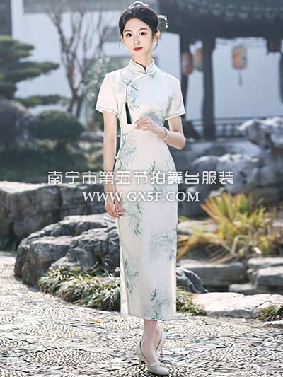 07G455白色短袖绿竹叶长旗袍