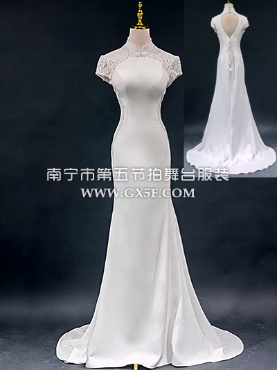 03G1376白色蕾丝短袖修身鱼尾拖尾长礼服旗