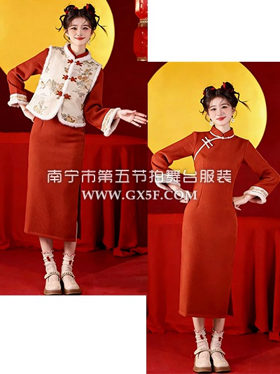 07G461杏色马甲橙红旗袍套装新年战袍拜年