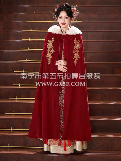 08G1737酒红色秀禾服毛领披风新娘新中式毛