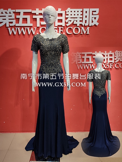 03G731藏蓝色圆领半透视金边鱼尾拖尾长礼