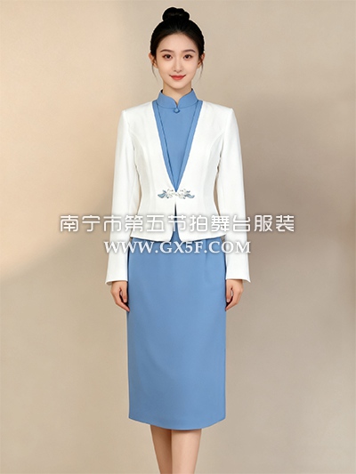 07G452白蓝短袖长旗袍礼仪旗袍连衣裙