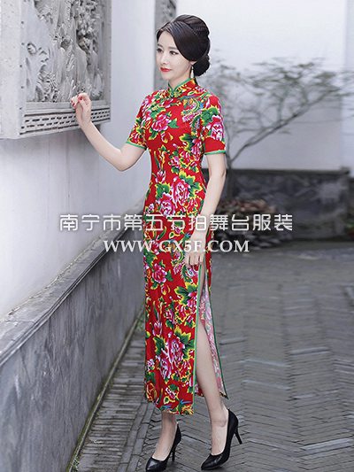 02G1497粉绿渐变中袖旗袍古典舞连衣裙