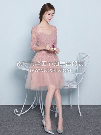05G571粉色V领无袖叶片绣花短礼服主持人礼